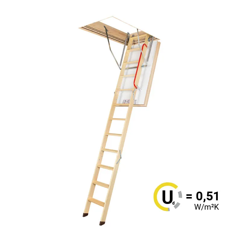 PROF 36 - трехсекционная утепленная лестница из скандинавской медленнорастущей ели, отличающейся повышенной прочностью, ступени из сосны, имеют антискользящие насечки. Лестница оснащена поворотным замком, надежно фиксирующим люк в закрытом состоянии. Высоту базовой модели можно увеличить при помощи дополнительной секции до 3500 мм. Размер короба: 1175х676 мм