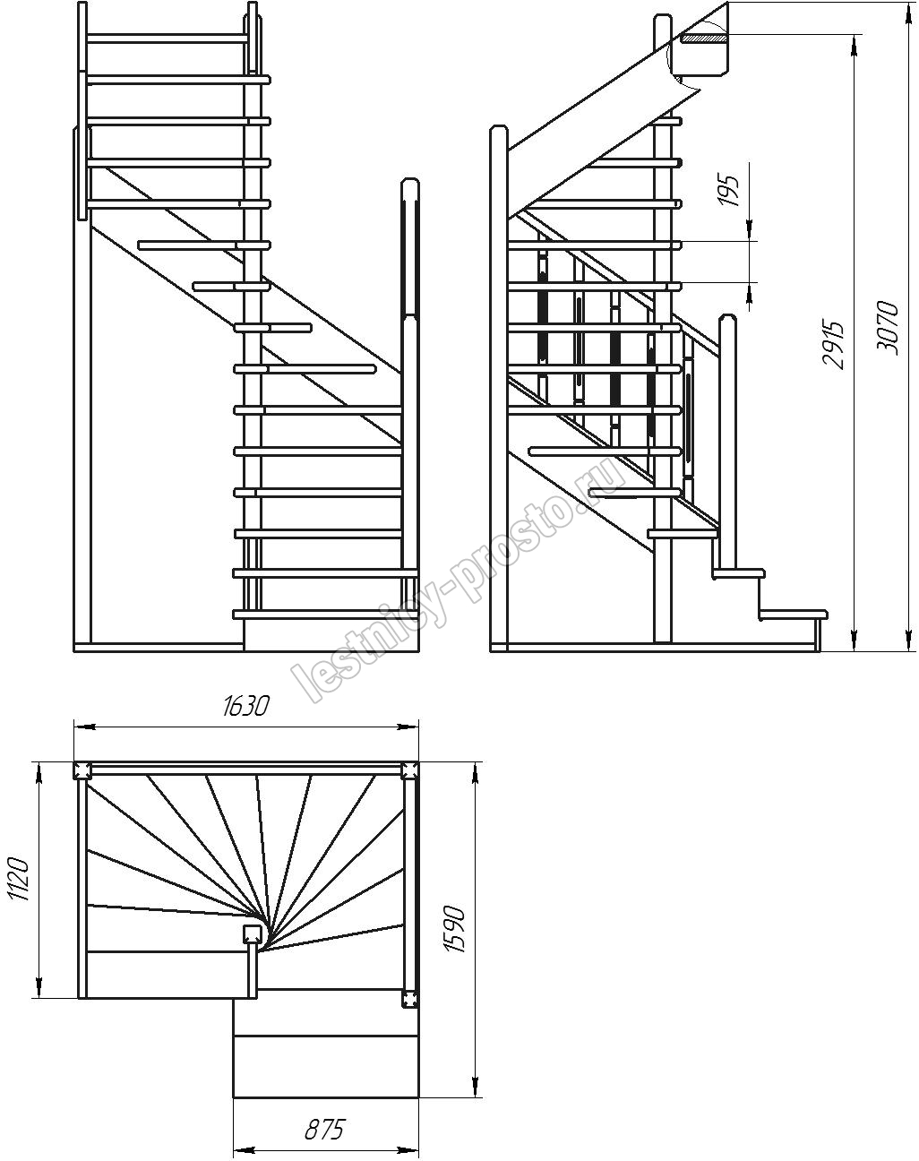 Деревянная межэтажная лестница ЛЕС-03 2915-3075 проем 1630-1120, Сосна