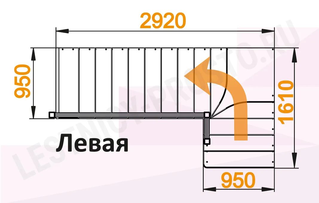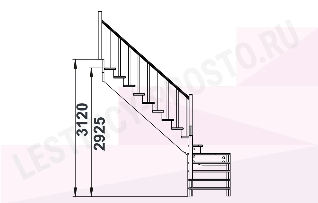 Ступени и поручень лестницы выполнены из дуба, остальные элементы из сосны. Возможно изготовление данной модели полностью из дуба. Базовый комплект включает в себя деревянные элементы лестницы и ограждения без какого-либо покрытия.