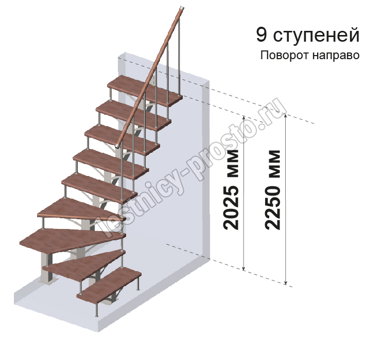 Комплект для Г-образной лестницы MONO h225 из 9 ступеней.