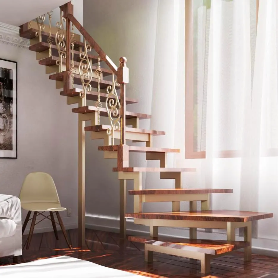 Универсальная лестница на металлическом каркасе с поворотной площадкой. Идеально дополнит любой интерьер, имеет современный вид и удобна в использовании. Монтаж осуществляется силами двух человек на объекте по указаниям, приведенным в паспорте на лестницу.