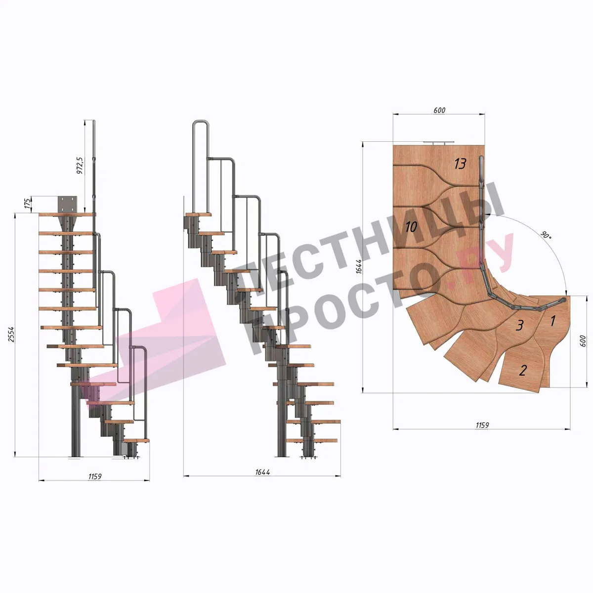 Лестница Prosto Urban Grey г-образная гусиный шаг 600 мм