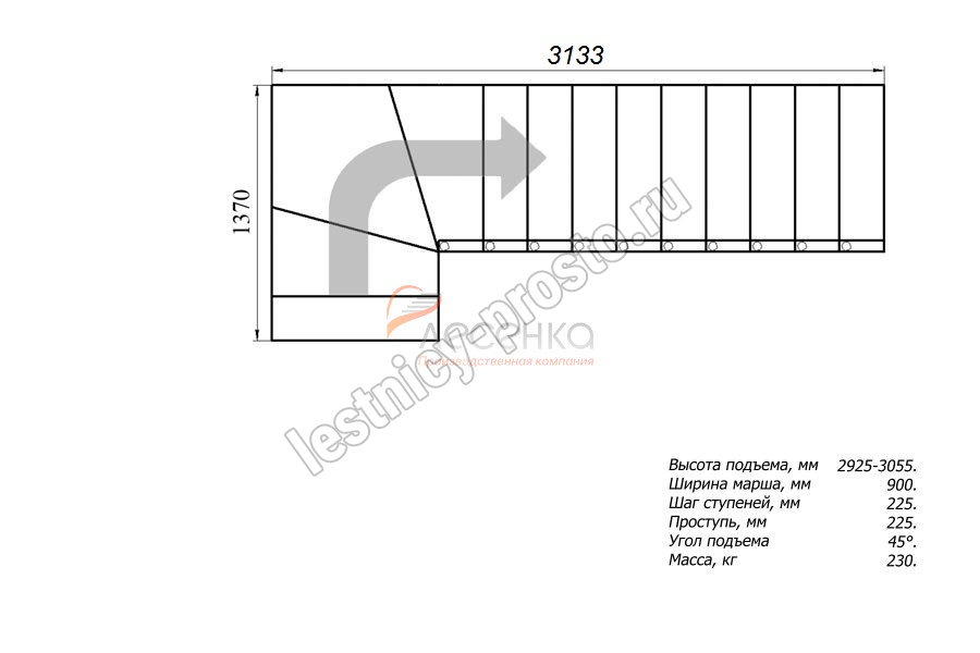 Модульная лестница Фаворит 225 2925-3055, Белый, Сосна, Крашеная