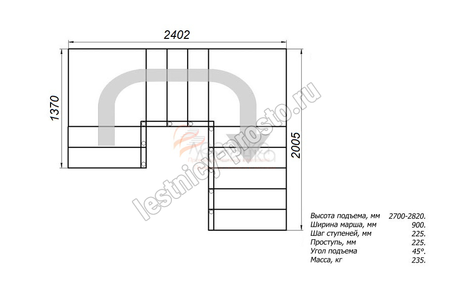 Модульная лестница Комфорт 225 2700-2820, Белый, Лиственница, Нержавеющая сталь