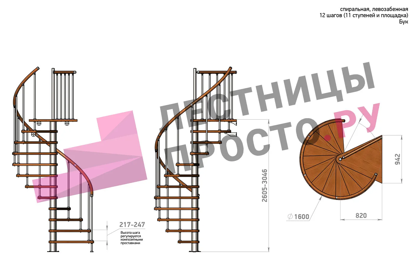 Винтовая лестница Prosto Spiral Black D160см, h260.5-304.6 см, бук