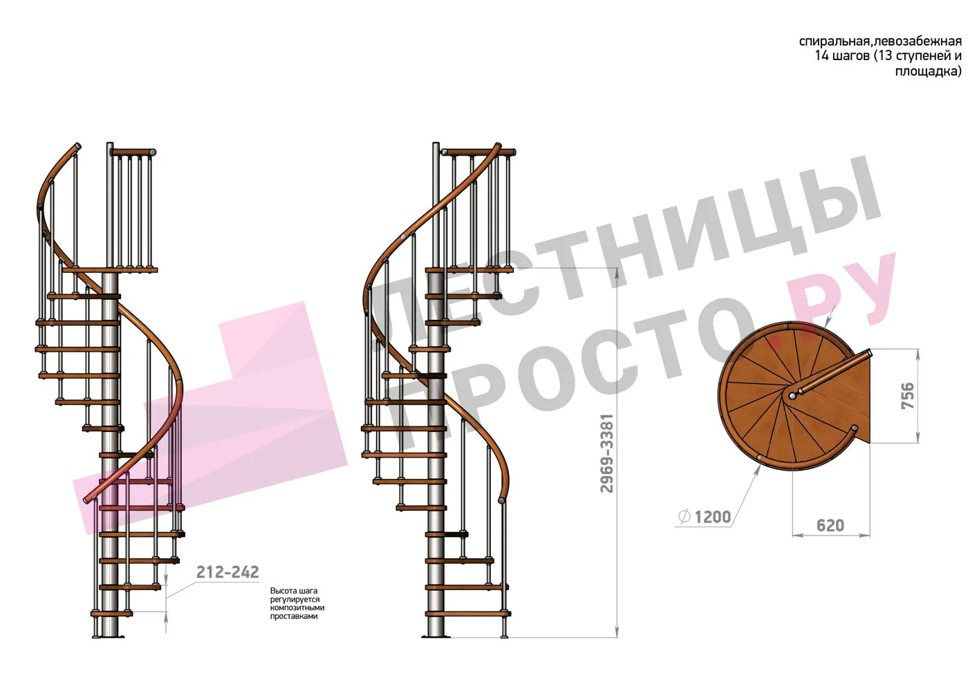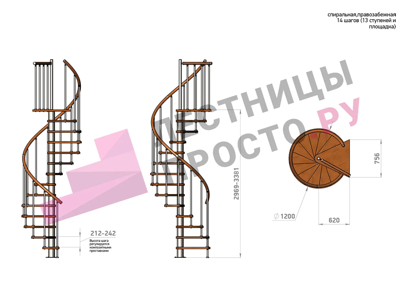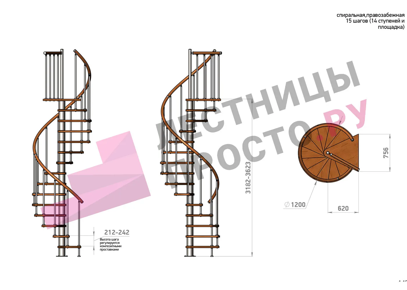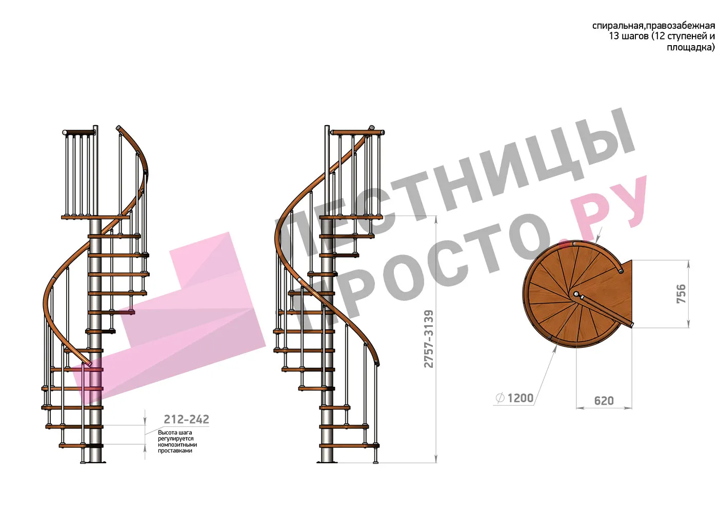 Высота ступеней регулируется с шагом 3 мм. в пределах 212-242 мм., благодаря чему, лестница прекрасно подгоняется под необходимую высоту.