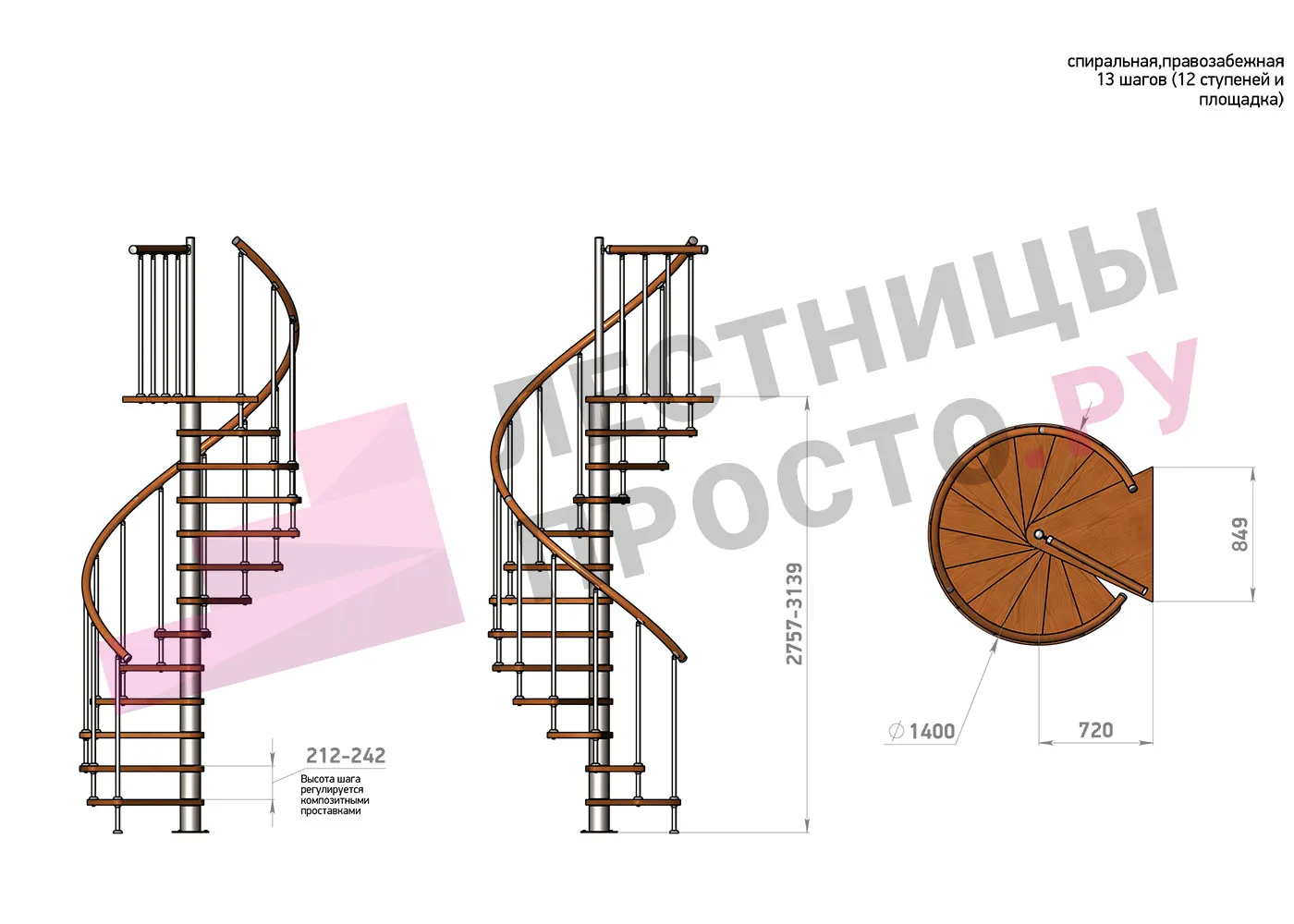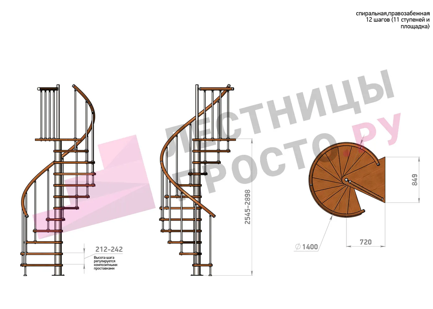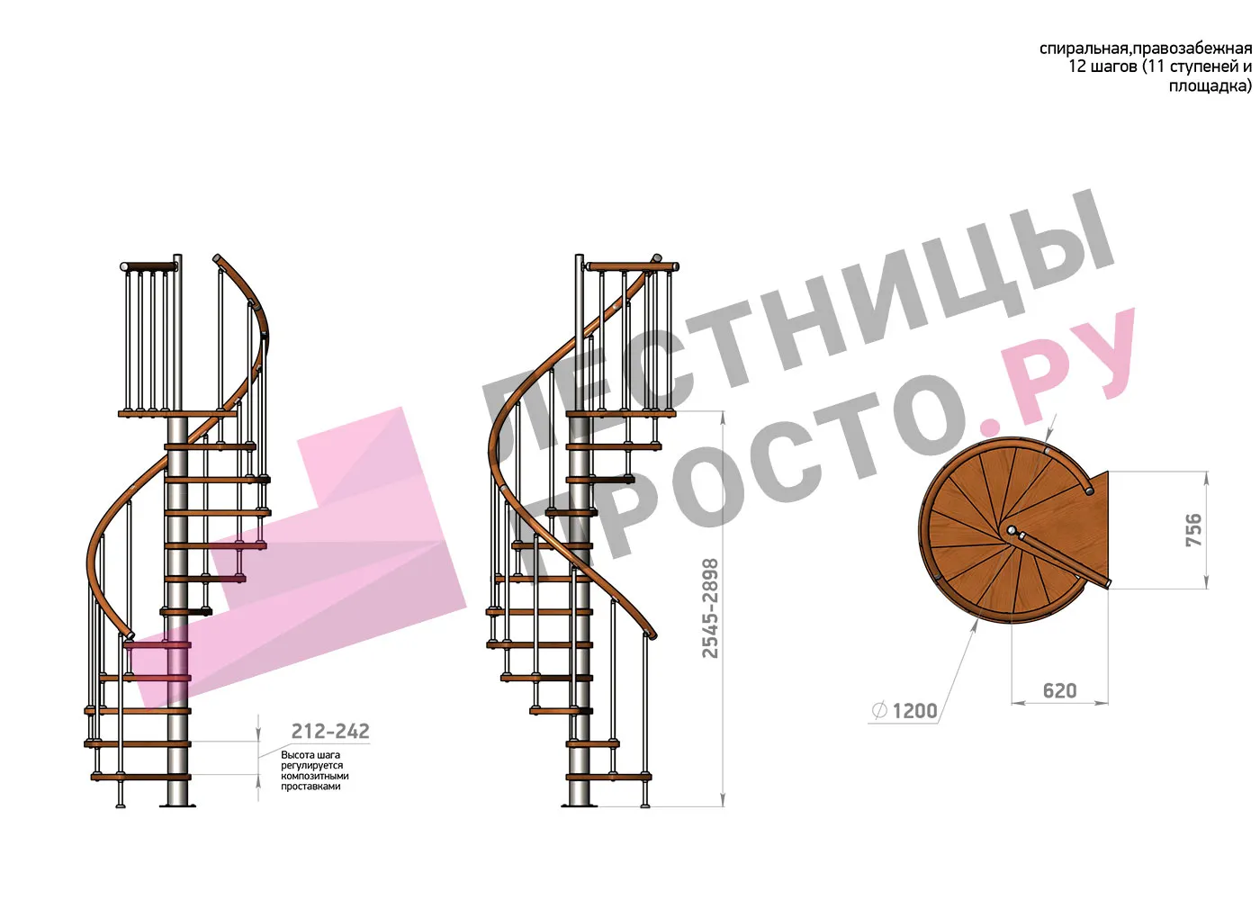 Высота ступеней регулируется с шагом 3 мм. в пределах 212-242 мм., благодаря чему, лестница прекрасно подгоняется под необходимую высоту.