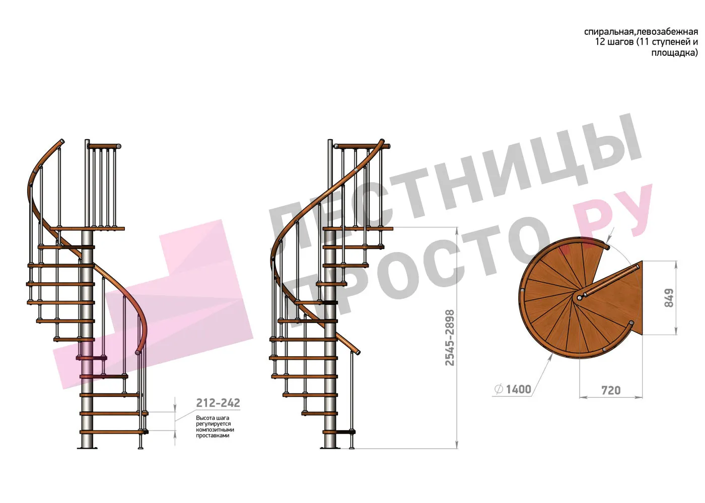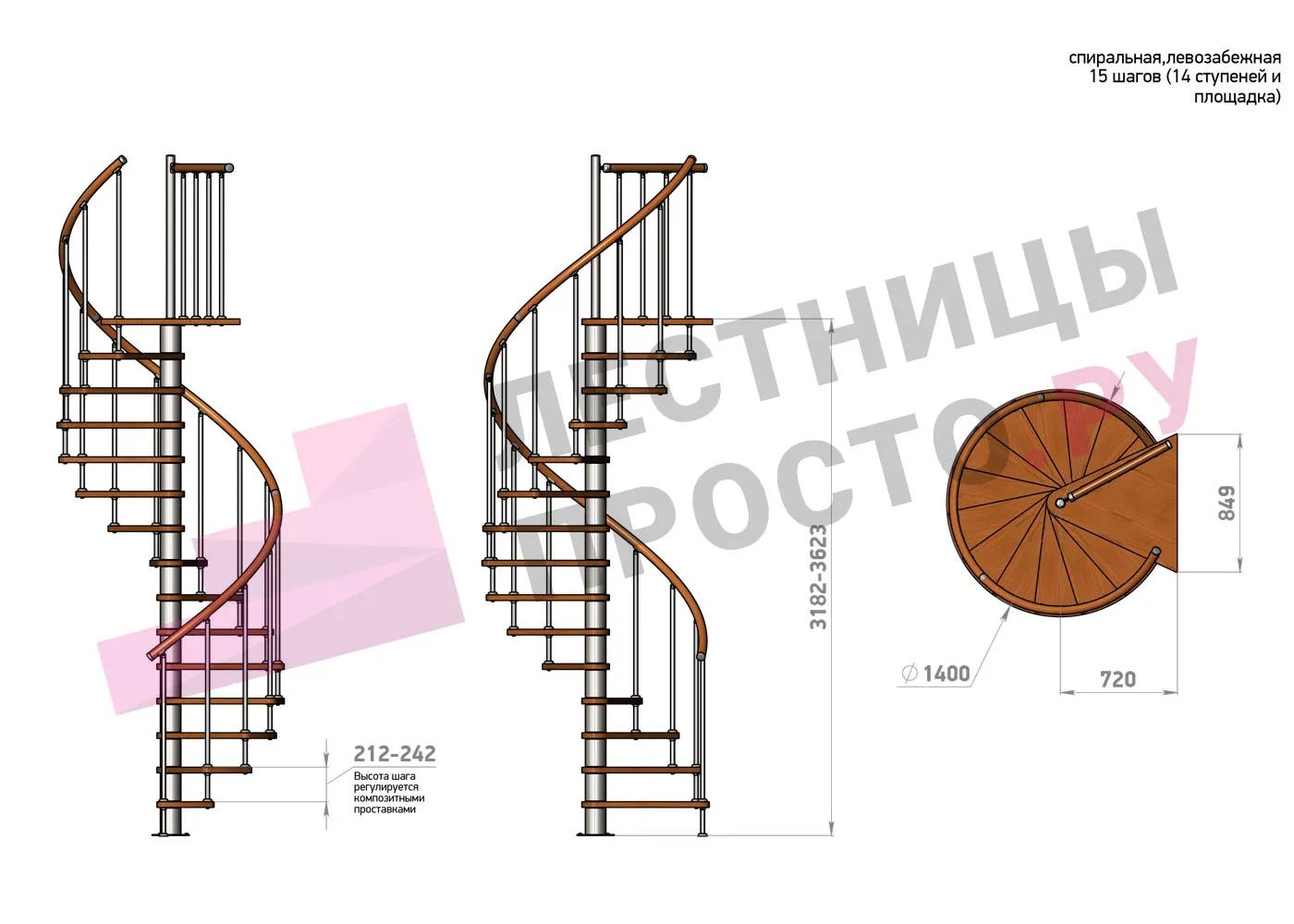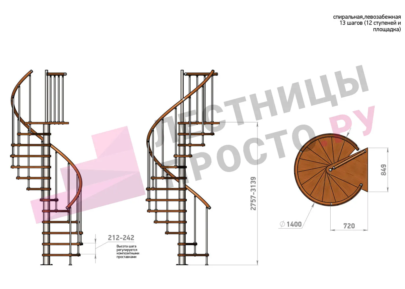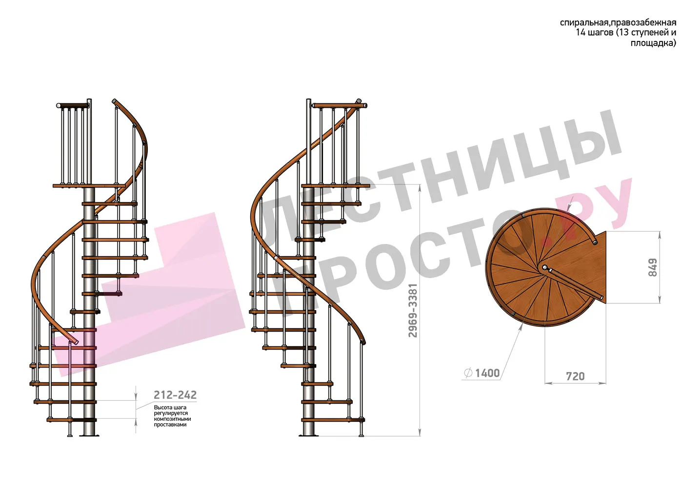 Высота ступеней регулируется с шагом 3 мм. в пределах 212-242 мм., благодаря чему, лестница прекрасно подгоняется под необходимую высоту.
