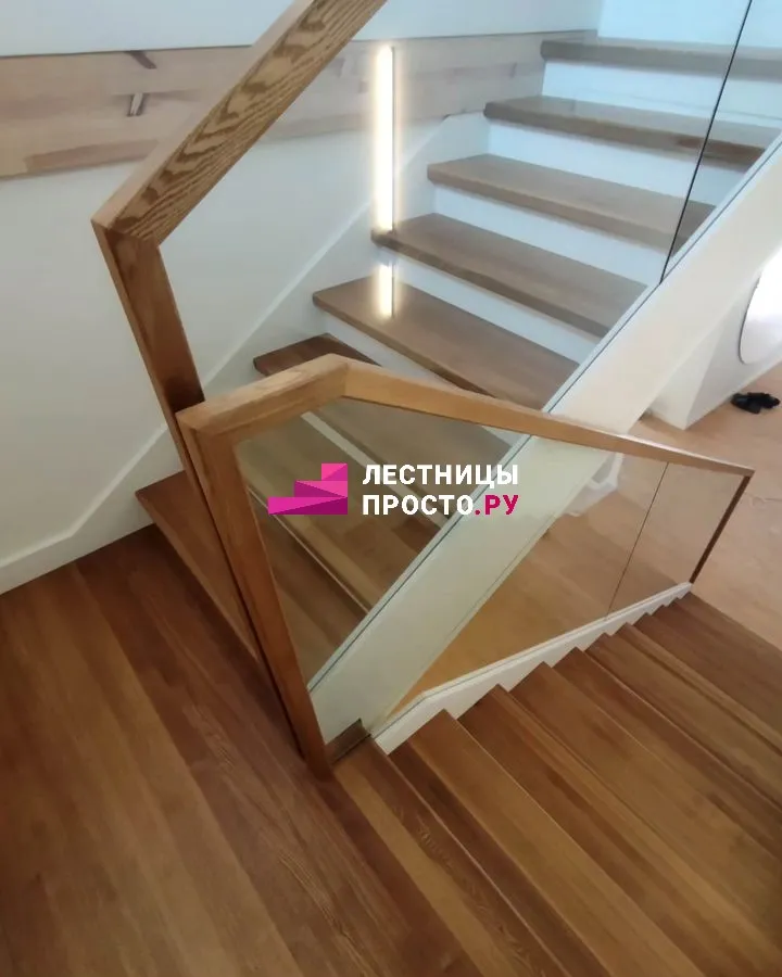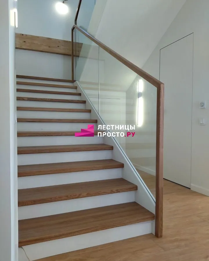 Облицовка бетонной лестницы дуб/керамогранит/стекло и освещение лестницы LP-1-53